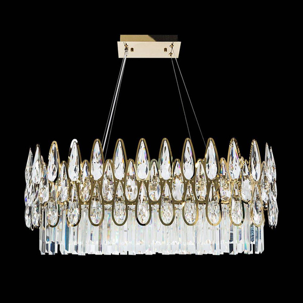 - Lampa dekorativna, wisząca szerokość: 80 cm, długość: 35 cm, kolor: transparentan/złoty, Skład: żelazo+kryształ , Zasilanie: CE 220-240V , Żarowka: 8 X E14 MAX 40W , Klasa energetyczna: A-G