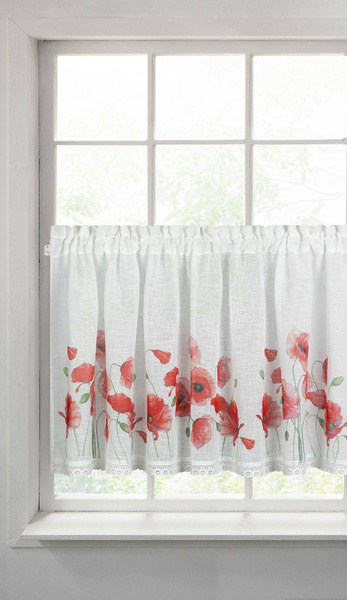 - Zazdrostka z nadrukiem zdobiona koronką szerokość: 150 cm, długość: 60 cm, kolor: biały, Gramatura: 110 GSM, Skład: 100% poliester