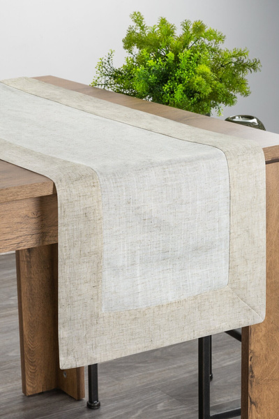 Trkač za stol prirodni stolnjak s bež ukrasnim volanom s porubom 40x140 s dodatkom lana Natura 10