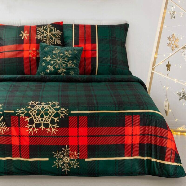 Božićni set posteljine ukrašen je modernim printom koji kombinira zeleno-crveni karirani uzorak i zlatne snježne pahulje. Ovaj elegantni motiv ispunit će vašu spavaću sobu jedinstvenim božićnim ugođajem. Posteljina je izrađena od pamučnog satena koji je baršunast na dodir i ugodan za tijelo.