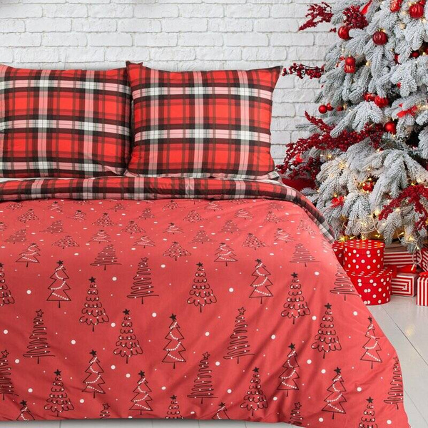 Božićni set posteljine 140x200 s motivom kariranog šara i slatkim božićnim drvcima Scarlet