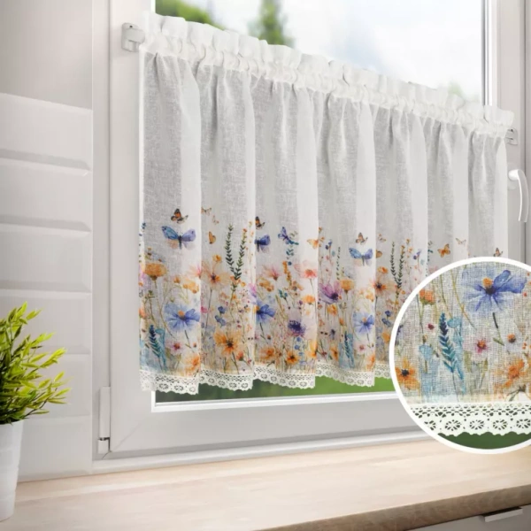 - Kratka zavjesa s printom ukrašen čipkom, širina: 150, duljina: 60, boja: bijela, težina: 110 GSM, sastav: 100% poliester
