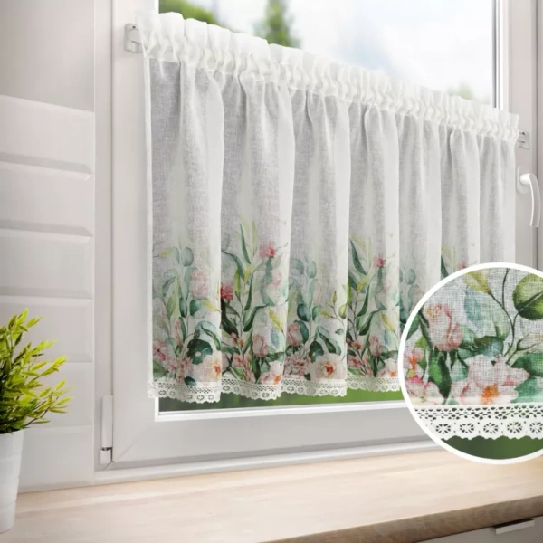 Bijelo-zelena kuhinjska zavjesa od gaze ukrašena cvjetnim printom i čipkom, 150x60 cm, ESTERA tunel