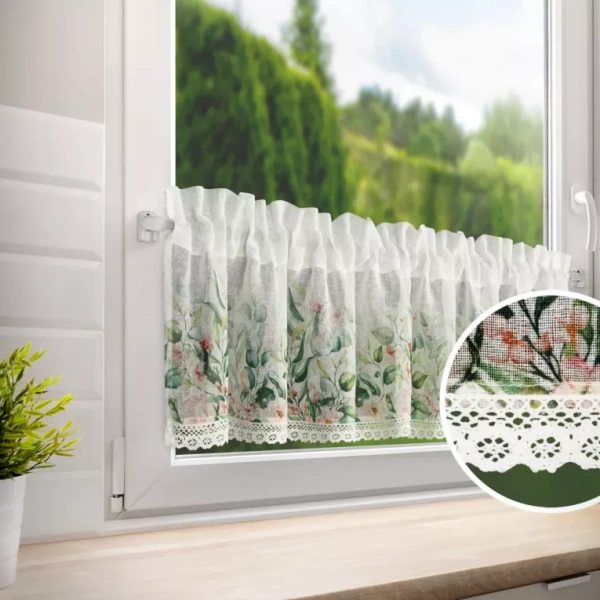 Bijelo-zelena kuhinjska zavjesa od gaze ukrašena cvjetnim printom i čipkom, 150x30 cm, ESTERA tunel