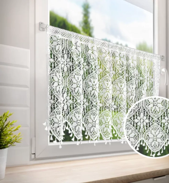 - Kuhinjska zavjesa s ažurnim cvjetnim uzorkom širina: 150, duljina: 60, boja: bijela, Težina: 230 GSM, Sastav: 60% pamuk, 40% poliester
