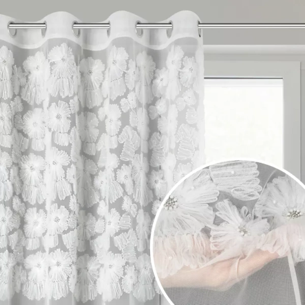 Bijela mrežasta zavjesa ukrašena cvijećem i malim 3D perlicama, 140x250 cm- JASMIN 3 Eva Minge