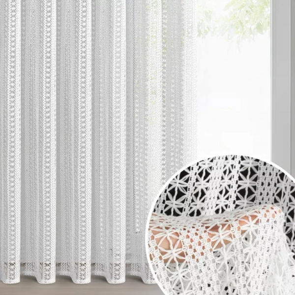 Lagana i elegantna zavjesa izrađena od mrežaste tkanine s dekorativnim tkanjem koje suptilno propušta svjetlost, stvarajući ugodnu, prirodnu atmosferu u prostoriji. Struktura tkanine odlikuje se dekorativnim, trodimenzionalnim uzorkom, dajući interijeru lagan i elegantan karakter.