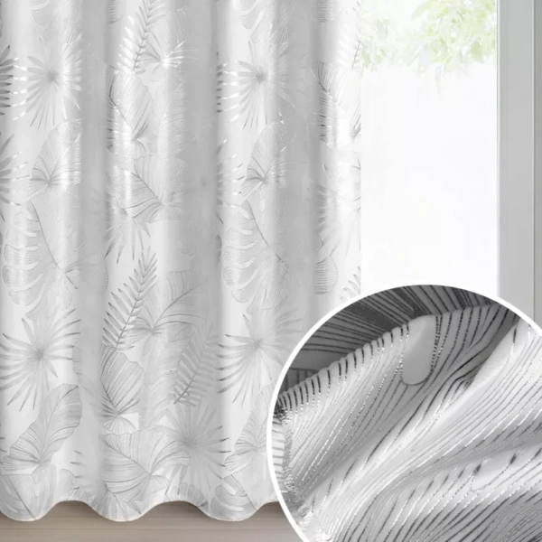 Bijelo-srebrna baršunasta zavjesa ukrašena sjajnim egzotičnim motivom lišća, 140x250 cm - ZARIA
