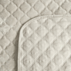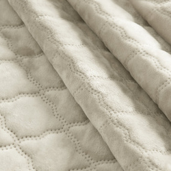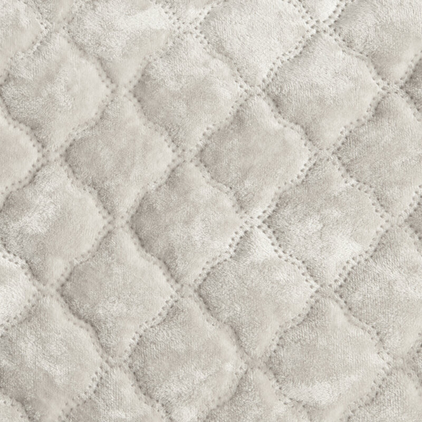 Ovaj elegantni baršunasti prekrivač kombinira luksuzni izgled s praktičnošću. Gornji dio je izrađen od sjajnog baršuna, vruće prešanog, prošivenog u dekorativnom arabesknom uzorku, što mu daje jedinstven karakter i suptilnu dubinu. Stražnja strana izrađena je od glatke, mat tkanine koja sprječava klizanje s kreveta, osiguravajući stabilnost i udobnost. Savršen kao upečatljiv ukras za spavaću sobu ili funkcionalan dodatak za svakodnevnu upotrebu. Karakteristike proizvoda:
