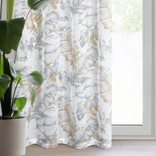 Elegantna zavjesa izrađena od lagane, poluprozirne gaze s melange teksturom, koja tkanini daje suptilnu dubinu i prirodni karakter. Njezina površina ukrašena je bež uzorkom lišća na bijeloj pozadini, upotpunjenim svjetlucavim zlatnim detaljima, dodajući eleganciju i suptilan sjaj prostoriji. Metalne rupice za vezivanje omogućuju brzu i jednostavnu ugradnju, a zavjesa prekrasno pada u mekim, prirodnim valovima. Karakteristike proizvoda: