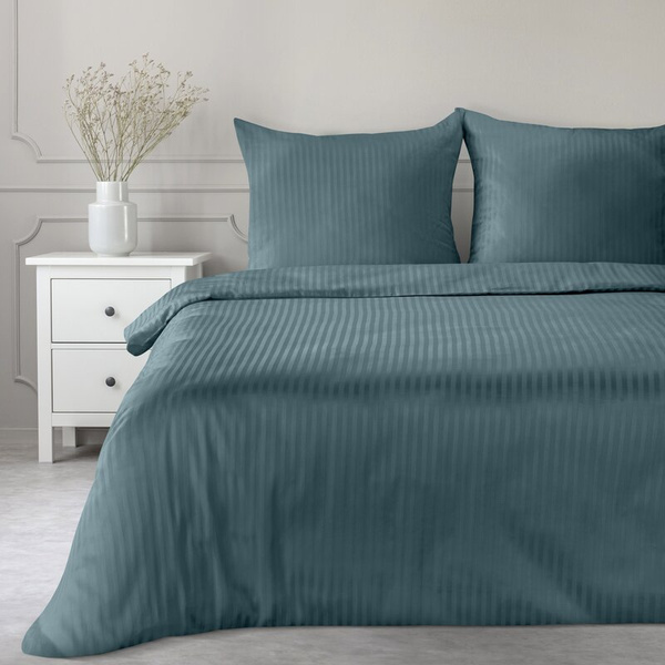 - Komplet jednobojne prugaste posteljine od saten damasta širine 220 cm dužine 200 cm Boja: mora. Težina: 125 GSM. Sastav: saten, 100% pamuk.