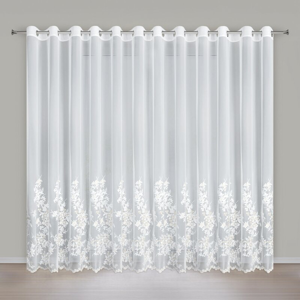 Ova zavjesa, izrađena od nježne mrežaste tkanine, očarava svojim suptilnim cvjetnim vezom, ukrašenim koncem boje šampanjca, koji se blago svjetluca. Njezin ukrasni rub završen je nježnim, izvezenim valom, dodajući lakoću i eleganciju cijelom aranžmanu. Zahvaljujući praktičnim ušicama, zavjesa formira savršene, meke valove i nevjerojatno se lako objesi na karnišu.